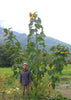 (H. anuus) Jere Lajos is a Romanian seed grower who sells his seeds at markets in various towns around Transylvania. Seeds are displayed in trays and are measured out for purchase with a walnut shell, the same one that his father used. Friends visited Jere and his wife at their home, and after a couple of hours drinking homemade wine and brandy, exchanged seed. This massive sunflower comes from that evening. Growing ~15’ tall, with bright yellow flowers up to 18” across, this sunflower will stand guard over your garden and provide much discussion and laughter. They are just comically large!