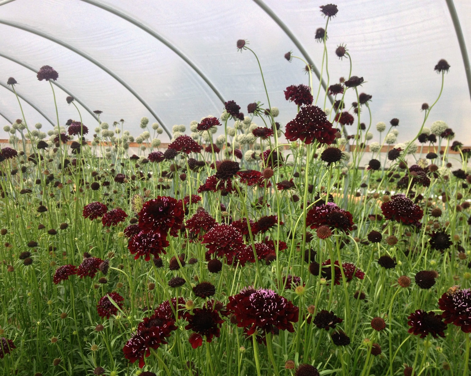 (Scabiosa atropupurea) Among the most dramatic, long-lasting and early-blooming flowers we grow as well as the most intense deep and very dark maroon/black blooms highlighted with speckles of whitish-pink on their long stamens. They have a mildly sweet smell and keep on blooming from late spring through early fall provided you cut spent flowers. Tall and graceful at 3-4’, they have long, strong stems perfect for bouquets. One of our very favorite cut flowers ideal for any type of bouquet and a lovely addition to your bee buffet!