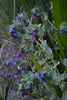 (Cerinthe major - AKA "Honeywort") Purple tipped green leaves, cascading bracts of dark and then light purple flowers rimmed in white, waxy and almost succulent stems...humans, bees and hummingbirds are all smitten! Perfect planted among succulents, in a border, a flower box, a bouquet… blooms from mid-summer on to medium frosts. One of our favorite flower discoveries, this native of the Greek Islands is somewhat rare and makes and absolutely lovely and unique cut flower. 24-30” tall reseeding annual.