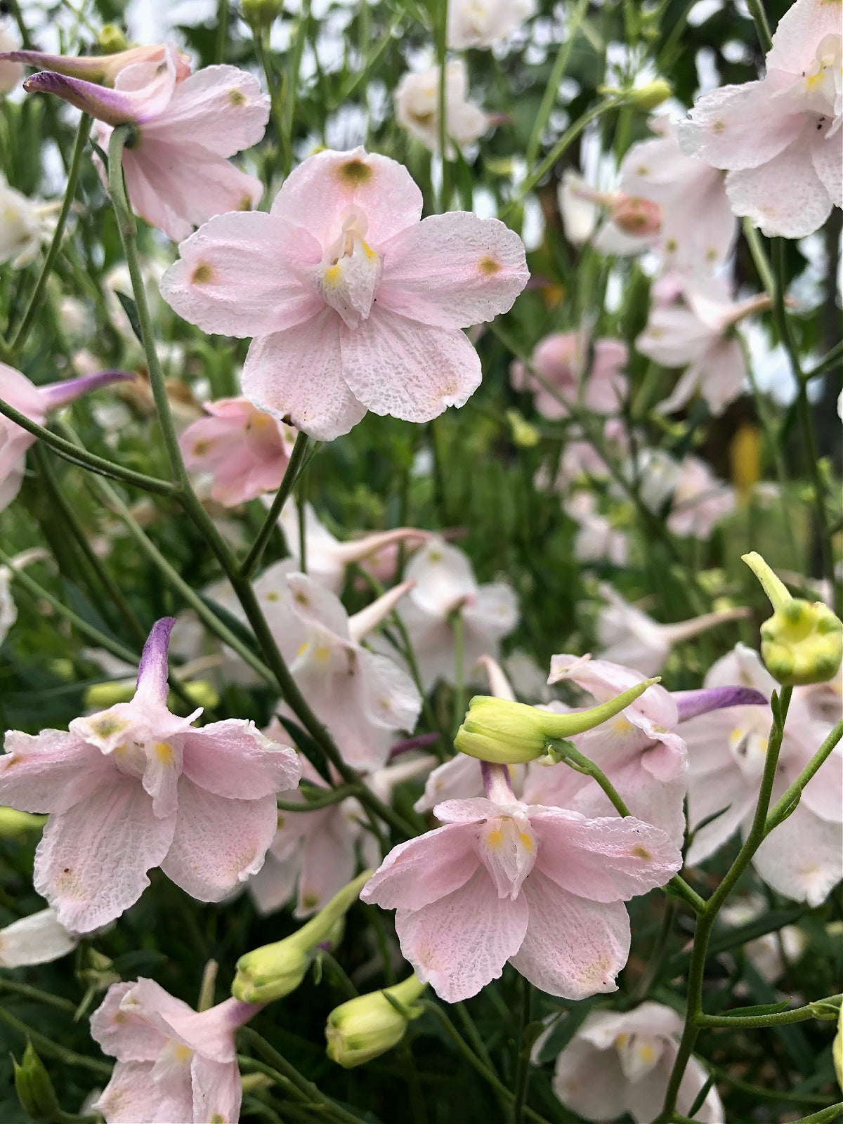(Delphinium chinensis) Loose, airy plants covered in delicate, pale pink-rose blooms accented with a green dot on the back of each petal. Quite different in shape and habit than other delphiniums, forming sprays of long-lasting cuts and long-blooming flowers from June-late September. A short lived perennial most often grown as an annual, sow seeds in either early fall or late winter (preferred). Looks delicate, is mighty. 1.5’ tall/wide. **all parts of plant are considered poisonous if consumed by humans or livestock**