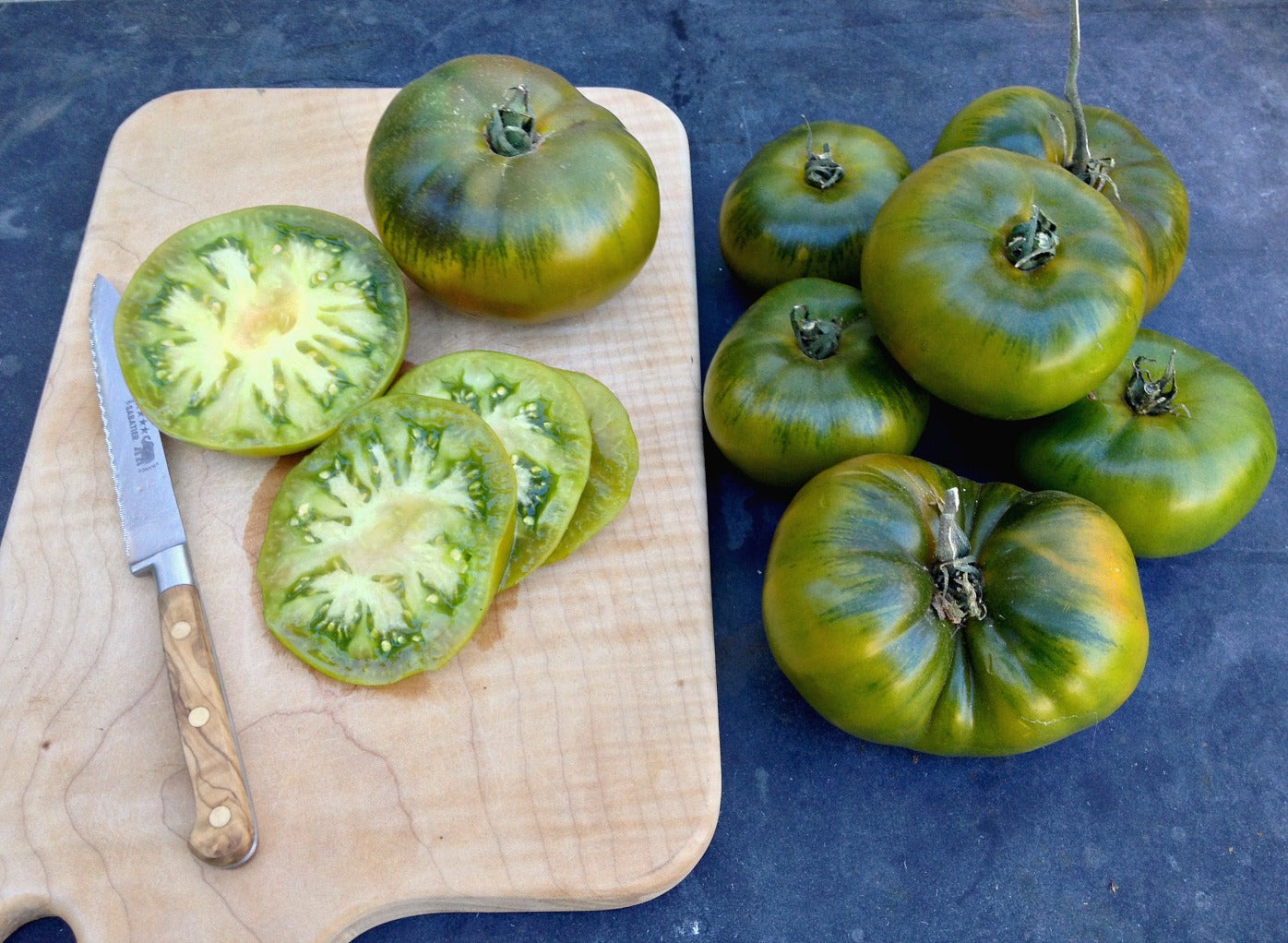 (Lycopersicon esculentum) It’s high time you added more green tomatoes to your mix! Moldovan Green is not just a terrific green tomato but a wonderful tomato all around. In fact, when it came to fresh slice-salt-and-eat, straight off the vine, tomato-ing, just about everyone who visited us at the farm agrees: Moldovan is among the cream of the crop (yes, that’s right, we just used “tomato” as a verb). The indeterminate sturdy vines are loaded with 8-12 oz beefsteak-type fruits that ripen perfectly in our climate (remember, our tomatoes are field-grown) and are wonderful slicers. Moldovan has a lovely lime green/golden blushed skin coloring and glowing green flesh with a taste that is very bright, mildly fruity, mild acid and very rich. As I edit this in mid-December when I can only dream of crates upon crates of tomatoes, the only thing left to say is, Grow Them! You will be happy you did. Promise.