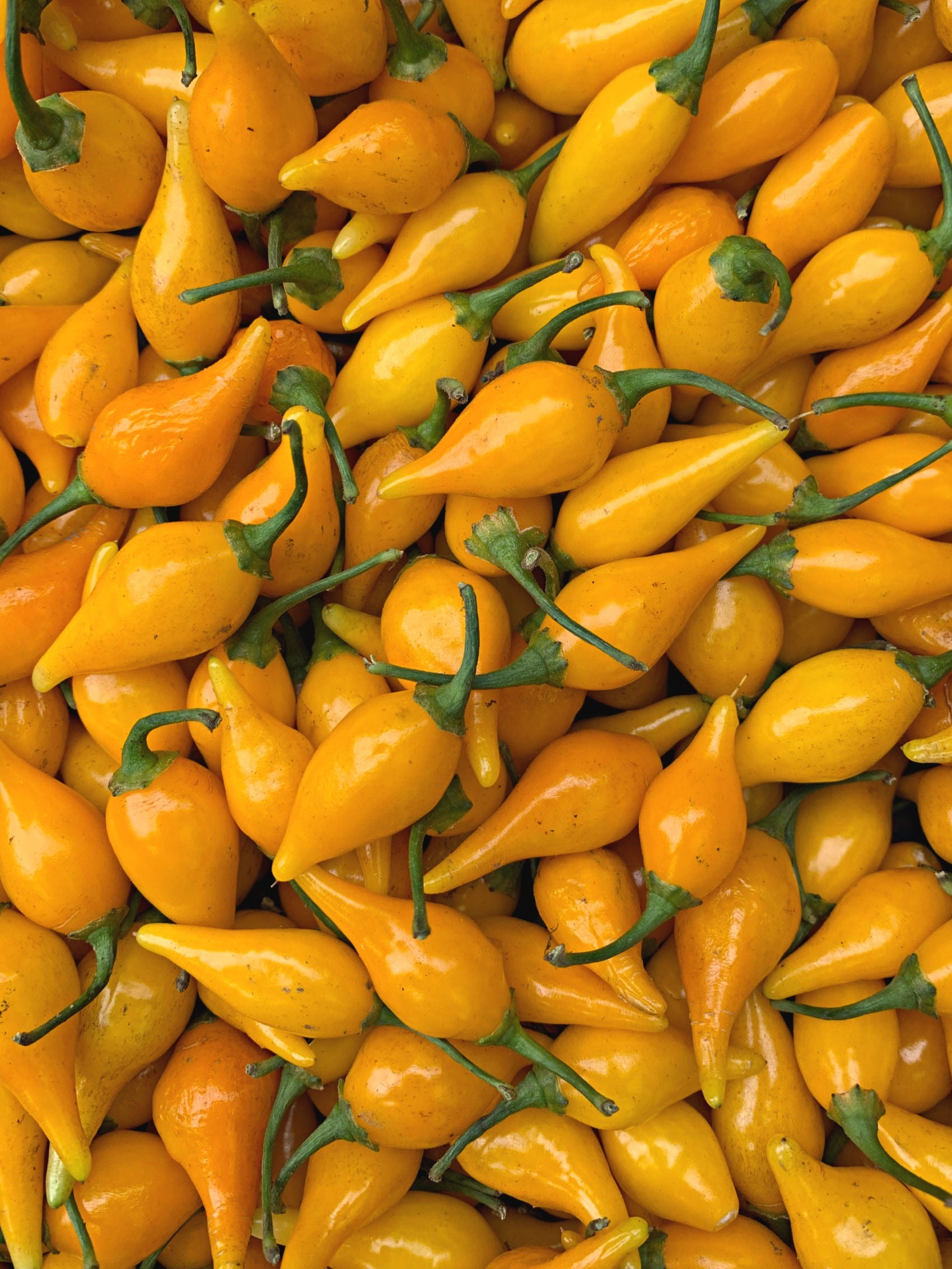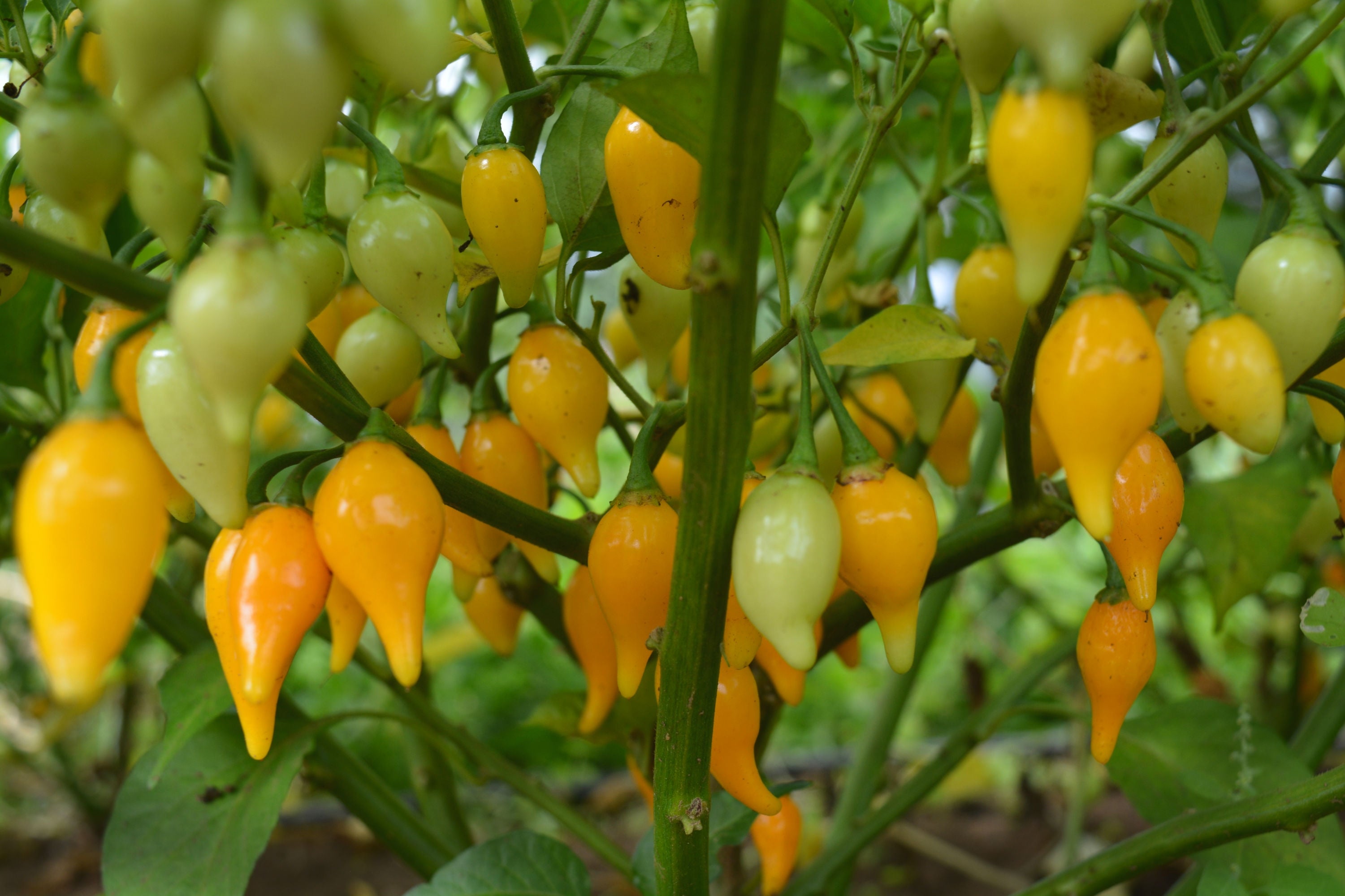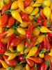 (Capsicum chinense) We are firmly on the Biquinho bandwagon. This little pepper from Brazil packs a lot of flavor into a little package. Marble-sized fruits with a pointed blossom end (biquinho is Portuguese for “little beak”) have all the tropical fruity flavor of the chinense peppers (habanero family) but with barely a suggestion of heat. Traditionally, mixed yellow and red peppers are pickled in a lightly sweetened 50/50 vinegar and cachaça (a sugarcane-based liquor) brine, which makes for delicious snacking or additions to hors d’oeuvres/cheese plates. Sturdy, upright and heavily branched 2’ plants with abundant sets of hanging fruit have a very attractive plant architecture that lends itself well to container growing. Prolific and early for a tropical pepper. See also 'Biquinho Red' for the red strain.