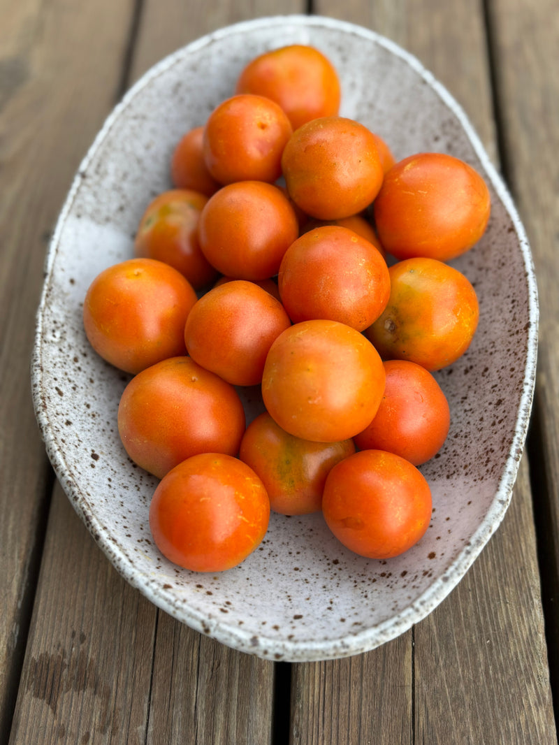 (Lycopersicon esculentum) Crispiano is a unique and wonderful storage tomato hailing from the town of the same name in the province of Taranto in southern Italy's Puglia region. Amusingly, it is a very firm (borderline crunchy) tomato, giving the name an extra layer of appropriateness. Selected for many years by farmers of the area for qualities that allow it to store well into the winter months, it is one of the most durable tomatoes we have grown. The fruits are slow to mature on indeterminate vines and never quite look or feel ripe to the touch, shifting from yellow with green streaked shoulders to an orange/red blush (giallorosso means yellow-red in Italian). Traditionally stored in single layers in wooden crates or hung in clusters ("Nzerte") similar to Piennoli, they can last for months after harvest in the right conditions. The flavor is defined by classic, very high acidity, a firm and toothsome flesh, and a burst of juicy seed/gel center. The context makes sense when considering another food tradition of the region Frise, a twice-baked circular bread that somewhat resembles a sort of bagel-cracker. Since ancient times Frise were also designed for storage, with their crispy texture and a circular shape allowing them to be strung through the center hole in bunches, thus a 'traveler's bread' to workers and fishermen who were away from home for stretches. Quickly rehydrated with a dip in water they made a substantial meal. More recently with the tomato as a topping the juice helps soften the bread while the firm flesh coats and seasons the top.
