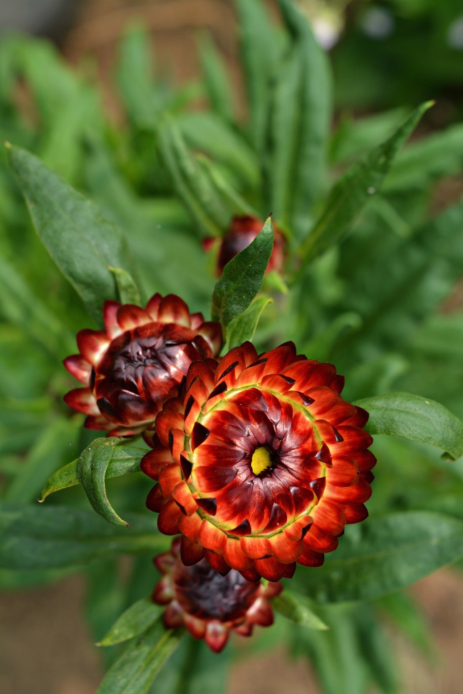 (Bracteantha bracteata) Remarkable scarlet red blooms to set your garden on fire! Bright red outer petals fade to orange and yellow centers on multi-branched upright 3-4' plants. The blooms have a dried papery texture even while fresh on the plant. Great for cut flowers, fresh and dried, and beautiful in flower wreaths, garlands, and garlic braids. Strawflowers are such cool and versatile flowers and last well into frosty late fall days.