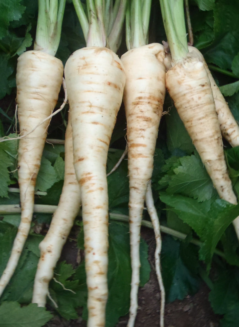 (Pastinaca sativa) Parsnips have an integral place in our winter kitchen: roasted as a side to slow-cooked lentils or risotto, pureed into a creamy, nutty soup, and even paper-thin atop pizzas. Their warming, sweet, earthy flavor is the perfect match for the hibernation time of year. Schleswiger Schnee came from a breeding program at Christiansen Biohof in northern Germany, part of a movement in collaboration with organizations like Saat:gut and Bioverita to establish high-market quality OP seed bred under organic conditions. Beautiful and shapely tapered white roots sweeten after frost. Good uniformity and storage qualities.
