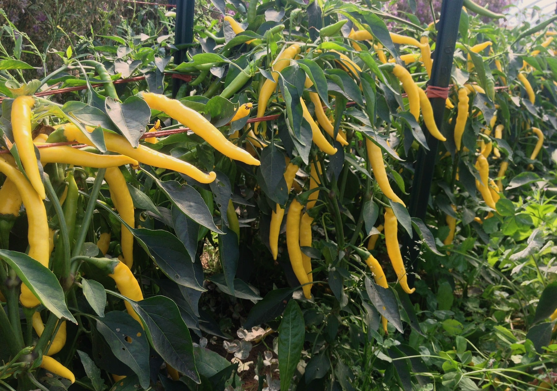 (Capsicum annuum) This beautiful and wonderfully productive chili was bred by the pioneering Austrian organic seed company ReinSaat. 'Sarit Gat,' meaning "Long Yellow," was bred from a diverse population of yellow chilis sourced from a farmer in Kosovo by ReinSaat breeder Reinhild Frech-Emmelmann, who then selected for color, uniformity, taste, and suitability for processing. Though it is known and available to some extent in Europe, it has virtually no presence this side of the Atlantic, and we’d like to change that. It has rivaled Czech Black as the most productive field-grown hot pepper we’ve ever grown, eventually requiring staking to prevent it from falling over from the weight of its fruit set. Uniform, canary-yellow fruits have the approximate heat and shape of a cayenne and are great for hot sauce, powdering, or simply spicing up meals. Beautiful, productive, and hot…now a staple in our kitchen garden and very suitable for commercial production.