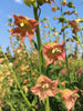 (Nicotiana glutinosa) We love a good name and when we read a couple of seed growers in Oregon had given this species of nicotiana the nickname “Peach Screamer” on account of its flowers, that look like little screaming mouths, we knew we had to help make it stick. Native to western South America (Chile, Peru, and Bolivia) this nicotiana takes its Latin name from the sticky, resinous texture of its leaves and stems. Its very showy peachy/salmony flowers are more cup-shaped than its tube-flowered relatives and with an airier placement along the stem. Grew to 3.5’ with many stems for us but we’ve read that shorter, smaller plants might be more common. The Hummingbirds loved this one! Doesn't last as a cut, but a stunner in the garden