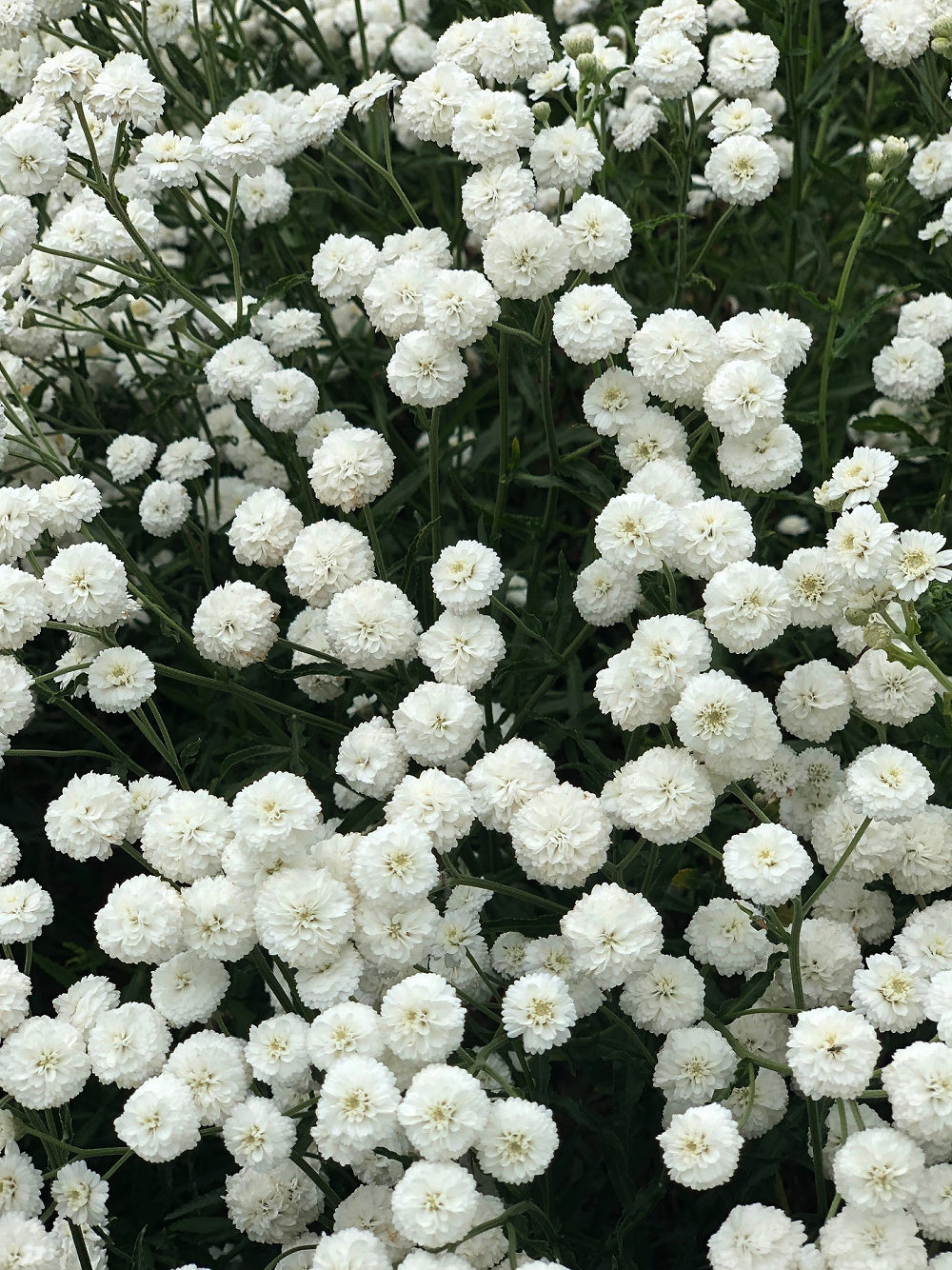 (Achillea ptarmica) Stunning bright white sprays of doubled blooms on 2.5' mounded foliage. A lovely addition to any garden, long blooming through October, beloved by pollinators and us! While these would be perfect as a filler, they are impressive on their own. Long lasting and stemmed fresh and a perfect dried flower for wreaths, etc. Not flashy, but calmly and clearly present. Perennial, first-year bloomer.